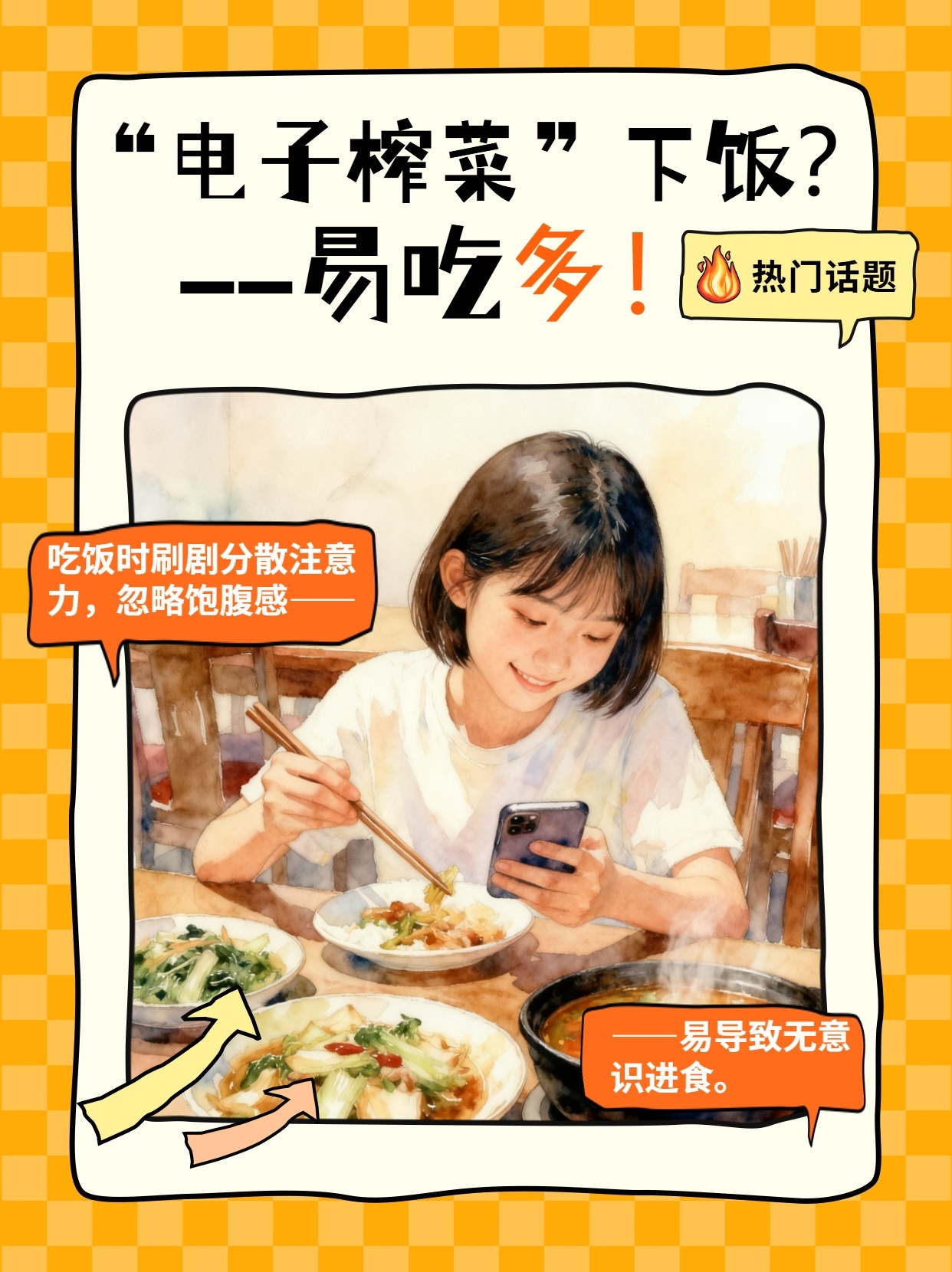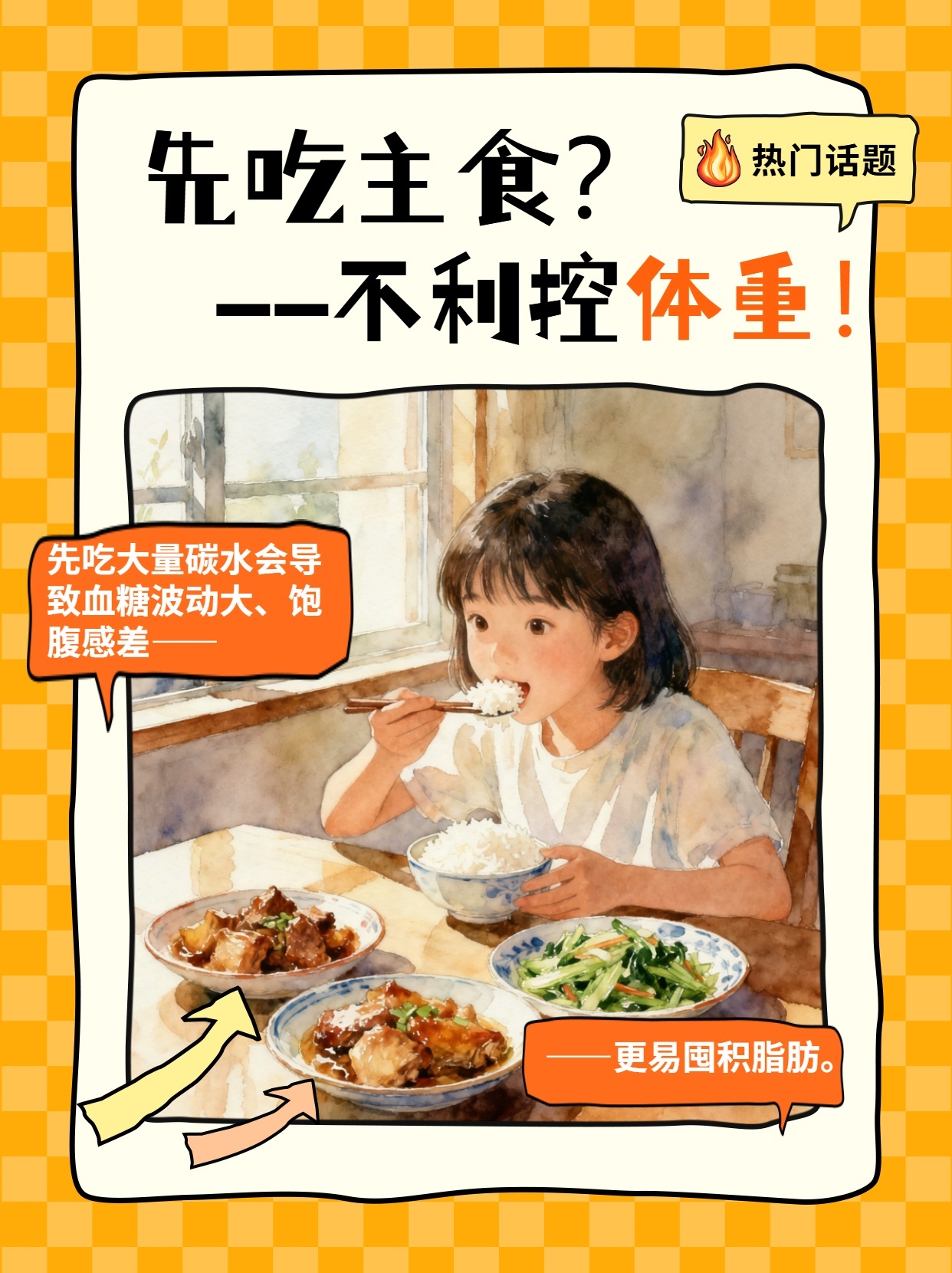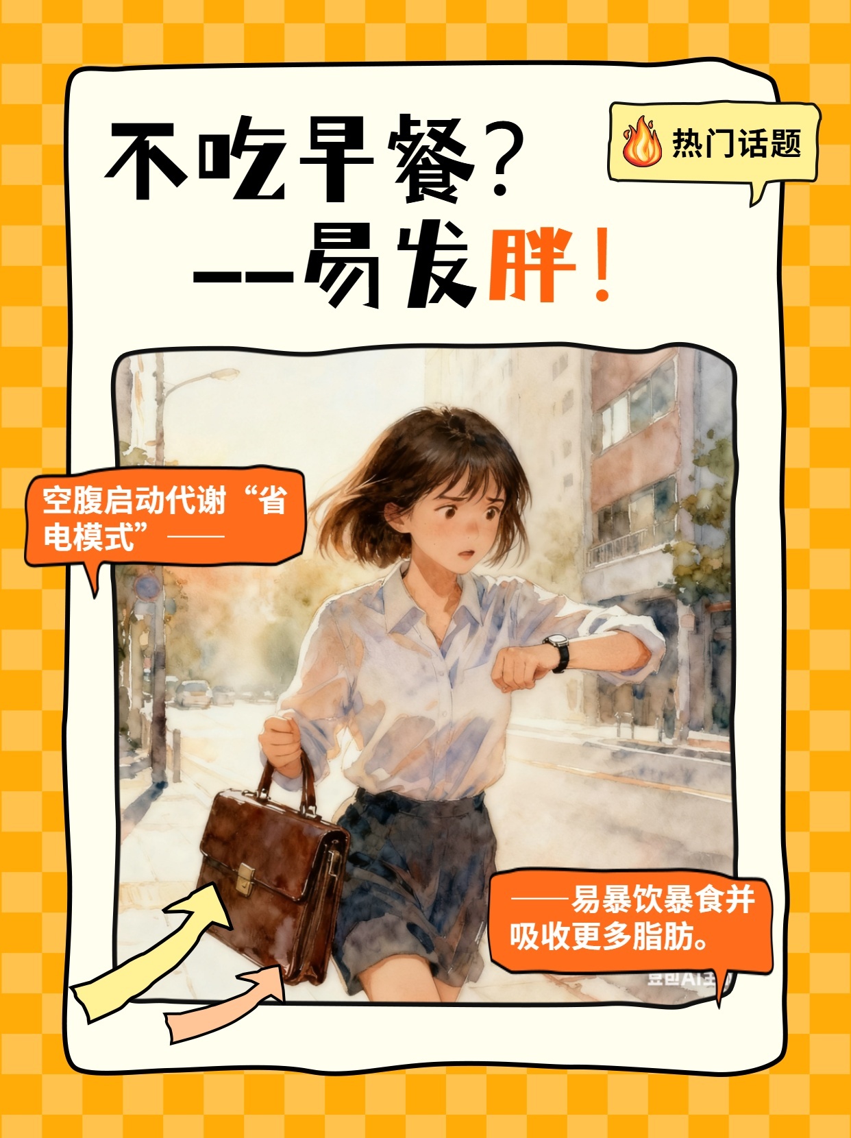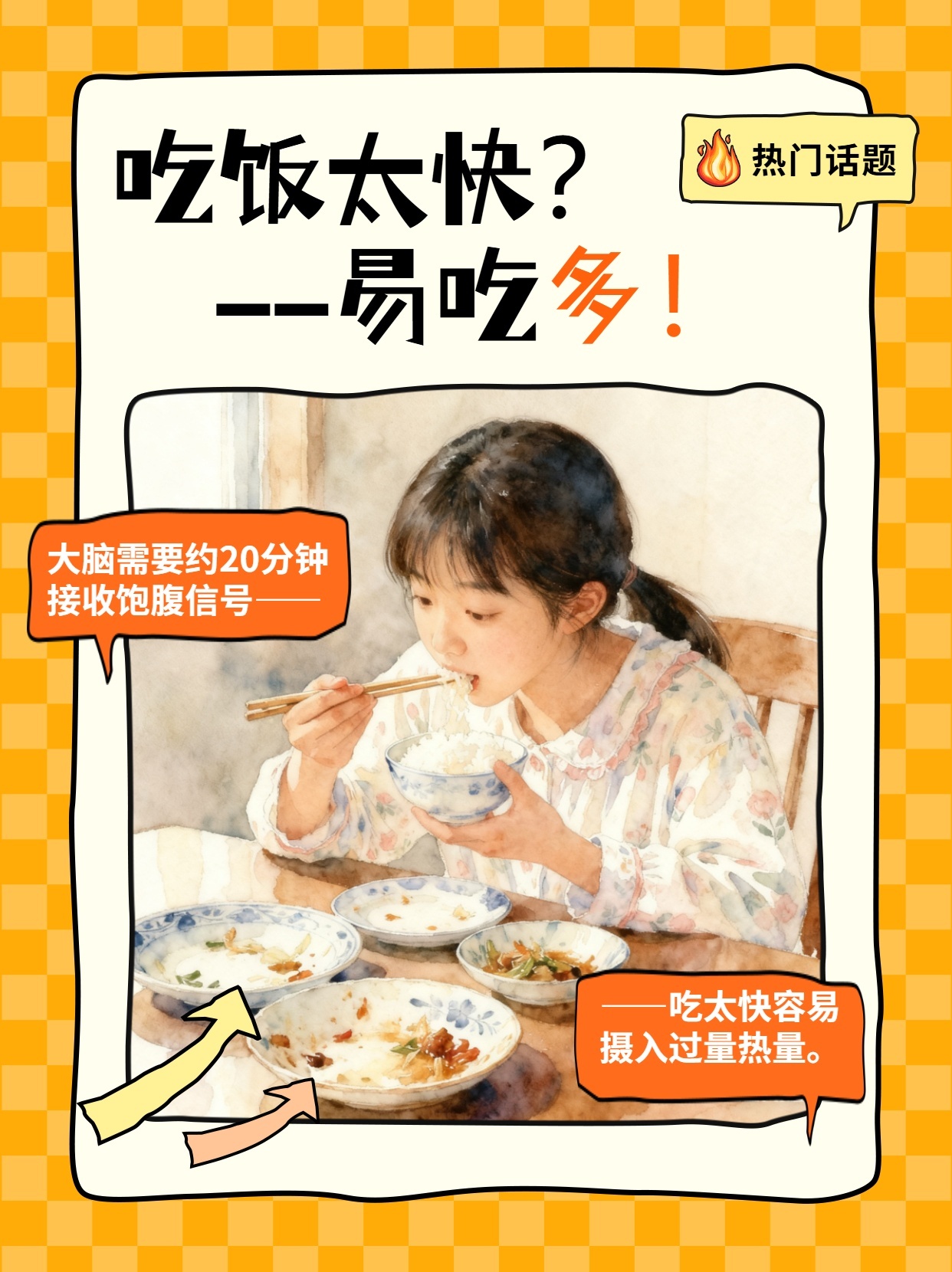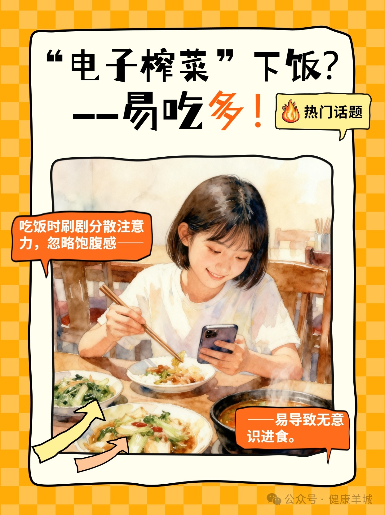 [惊讶]很多人减肥失败并不是因为不努力,而是因为一些看似无害的日常饮食习惯在悄悄影响体重控制。10个常见但容易被忽视的饮食习惯,它们会导致体重增加或减肥困难[让我看看]:[凋谢]1. 不吃早餐易发胖空腹启动代谢“省电模式”91快牛,易暴饮暴食并吸收更多脂肪。 [凋谢]2. 吃饭太快易吃多大脑需要约20分钟接收饱腹信号,吃太快容易摄入过量热量。 [凋谢]3. “电子榨菜”下饭易吃多吃饭时刷剧分散注意力,忽略饱腹感,易导致无意识进食。 [凋谢]4. 先吃主食不利控体重先吃大量碳水会导致血糖波动大、饱腹感差,更易囤积脂肪。 [凋谢]5. 菜汤泡饭热量高菜汤油多盐多,泡饭易吃多,增加脂肪和钠摄入。 [凋谢]6. 饭后马上吃水果易增热量饱餐后吃水果等于额外摄入糖分,不利于血糖和体重控制。 [凋谢]7. “酥脆”食品易上瘾高油高糖高盐食品口感好、声音脆,易让人停不下来。 [凋谢]8. 情绪性进食易胖用吃缓解压力时,更倾向于高热量食物,脂肪易堆积。 [凋谢]9. 喝水少代谢慢缺水会降低饱腹感与代谢率,间接促进脂肪囤积。 [凋谢]10. 久坐不动易发胖长时间久坐减少热量消耗,脂肪堆积,增加代谢疾病风险。[让我看看]减肥不只是“少吃多动”,更要识别并改正这些隐性饮食习惯。通过调整日常饮食行为,可以更高效、健康地管理体重。[加油]本文知识点参考自“科普中国”公众号文章本文图片来源:AI生成+笔格设计编辑:梁晓珊校对:翁锦宁审核:王志伟