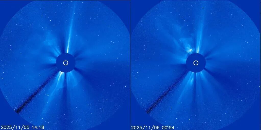 北京时间11月5日19时19分以及11月6日6时7分,太阳再次耀斑两连爆,最大强度分别为M7.4级和M8.6级,并伴随较为明显的日冕物质抛射(CME)。