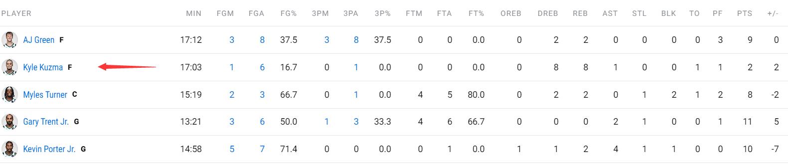 作为球队的先发大前锋,全场比赛17分钟,6中1,三分1中0,拿到2分8篮板1助攻1失误,命中率16.7%。最离谱的是在篮下出手了4次只命中一球,上篮都上出了一个过桥!库兹马这个状态真是令人无奈。