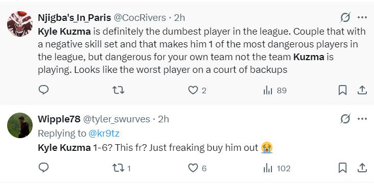 美球迷:库兹马绝对是联盟最愚蠢的球员,加上他糟糕的表现,他成为联盟最具威胁的球员之一,他这种威胁是针对自己的球队,看起来库兹马是联盟最差的球员之一。